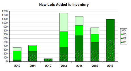 So far in 2016 there have been 9 platted or raw land purchases by builders with a combined total of 621 platted lots. Five properties with 464 lots have already started to be developed. Of these, 132 could be developed in 2016. This would leave 485 to be introduced in 2017. Two of the transactions included raw land which will require rezoning and entitlements which will most likely push the estimated 450+ future lots into 2018.