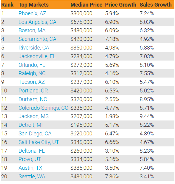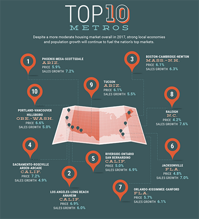 Despite a more moderate housing market overall in 2017, strong local economies and population growth will continue to fuel the nation’s hottest markets. The realtor.com® 2017 top 10 housing markets based on price and sales gains are: 1. Phoenix-Mesa-Scottsdale, Ariz.; 2. Los Angeles-Long Beach-Anaheim, Calif.; 3. Boston-Cambridge-Newton, Mass.-N.H.; 4. Sacramento–Roseville–Arden-Arcade, Calif.; 5. Riverside-San Bernardino-Ontario, Calif.; 6. Jacksonville, Fla.; 7. Orlando-Kissimmee-Sanford, Fla.; 8. Raleigh, N.C.; 9. Tucson, Ariz.; and 10. Portland-Vancouver-Hillsboro, Ore.-Wash.